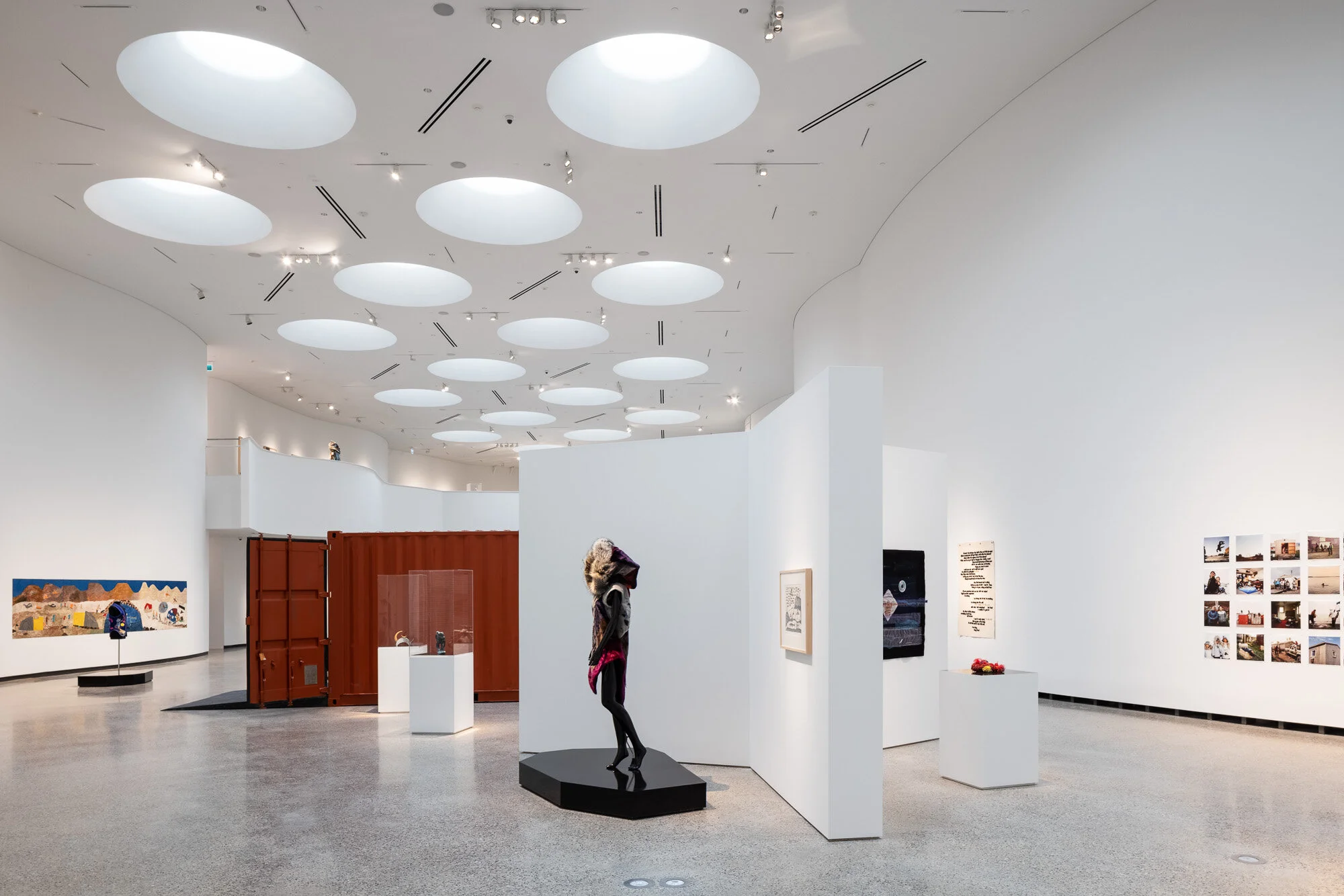Including 80 artists from Inuit Nunangat, Greenland and Alaska, the sprawling showcase not only challenges preconceived assumptions of Inuit art by mixing drawings and sculpture with painting, digital media and even drone photography but also includes a subtle exhibition design and graphic system by two emerging Inuk designers: Winnipeg-based Nicole Luke and Toronto-based Mark Bennett, respectively. (A mezzanine gallery with a similarly sweeping profile provides an additional exhibition area above; new studio spaces and classrooms are also included on this floor.)